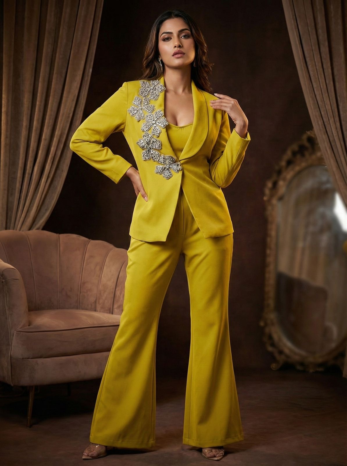 A contemporary power look crafted with couture detailing. The crystal floral appliqué on the blazer lends artistic elegance, while the bustier and flared pants create a flattering, elongated silhouette. A versatile ensemble that transitions effortlessly from formal gatherings to high-end evening wear.