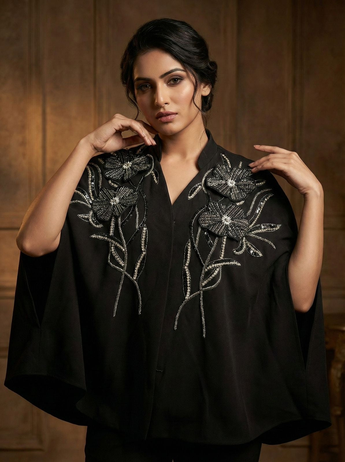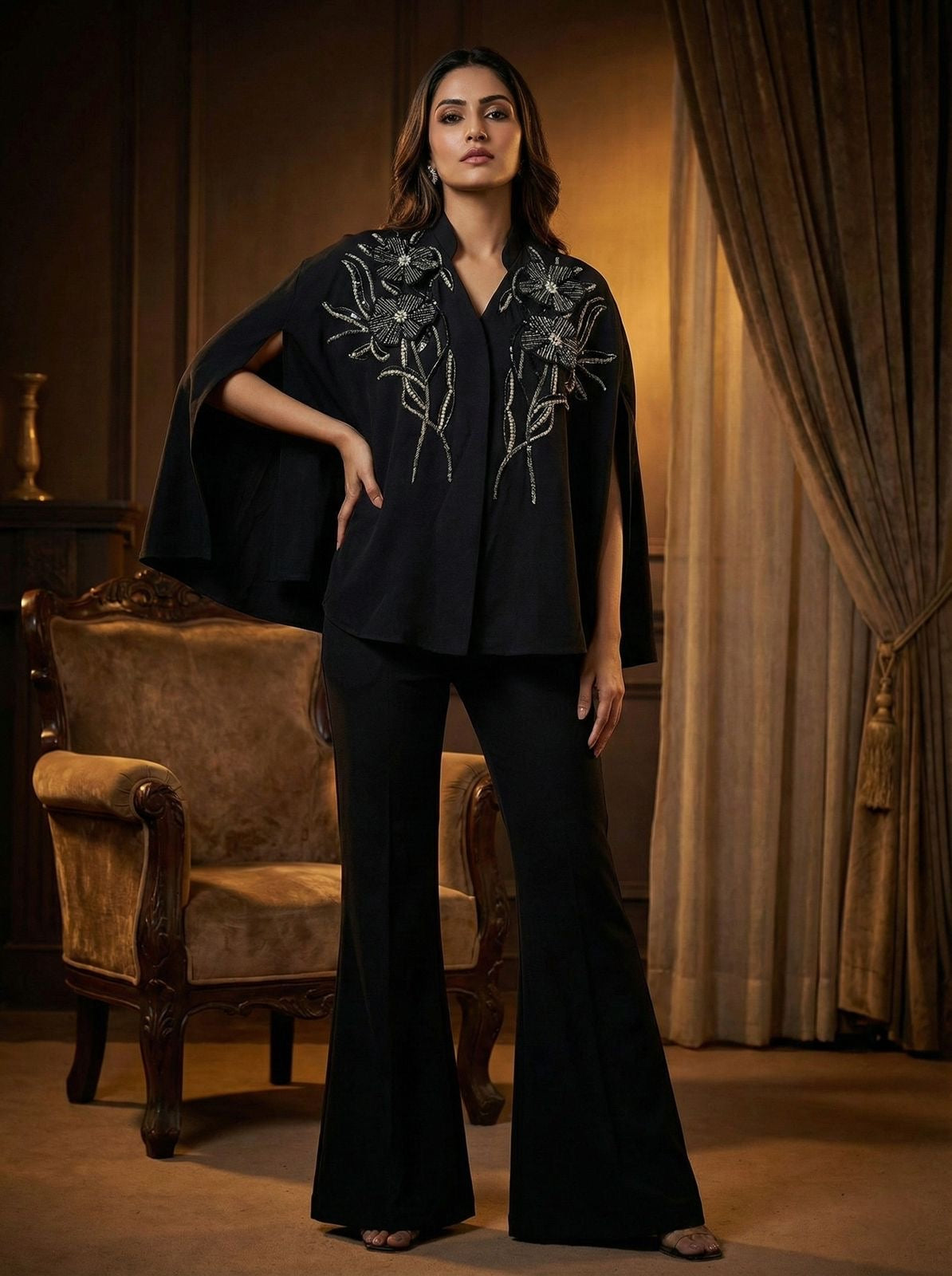 An artistic fusion of classic tailoring and couture detailing. The cape-inspired top is adorned with blooming floral embroidery, adding texture and depth, while the wide-leg pants ensure comfort with elegance. A timeless ensemble designed to transition seamlessly from formal gatherings to evening celebrations.