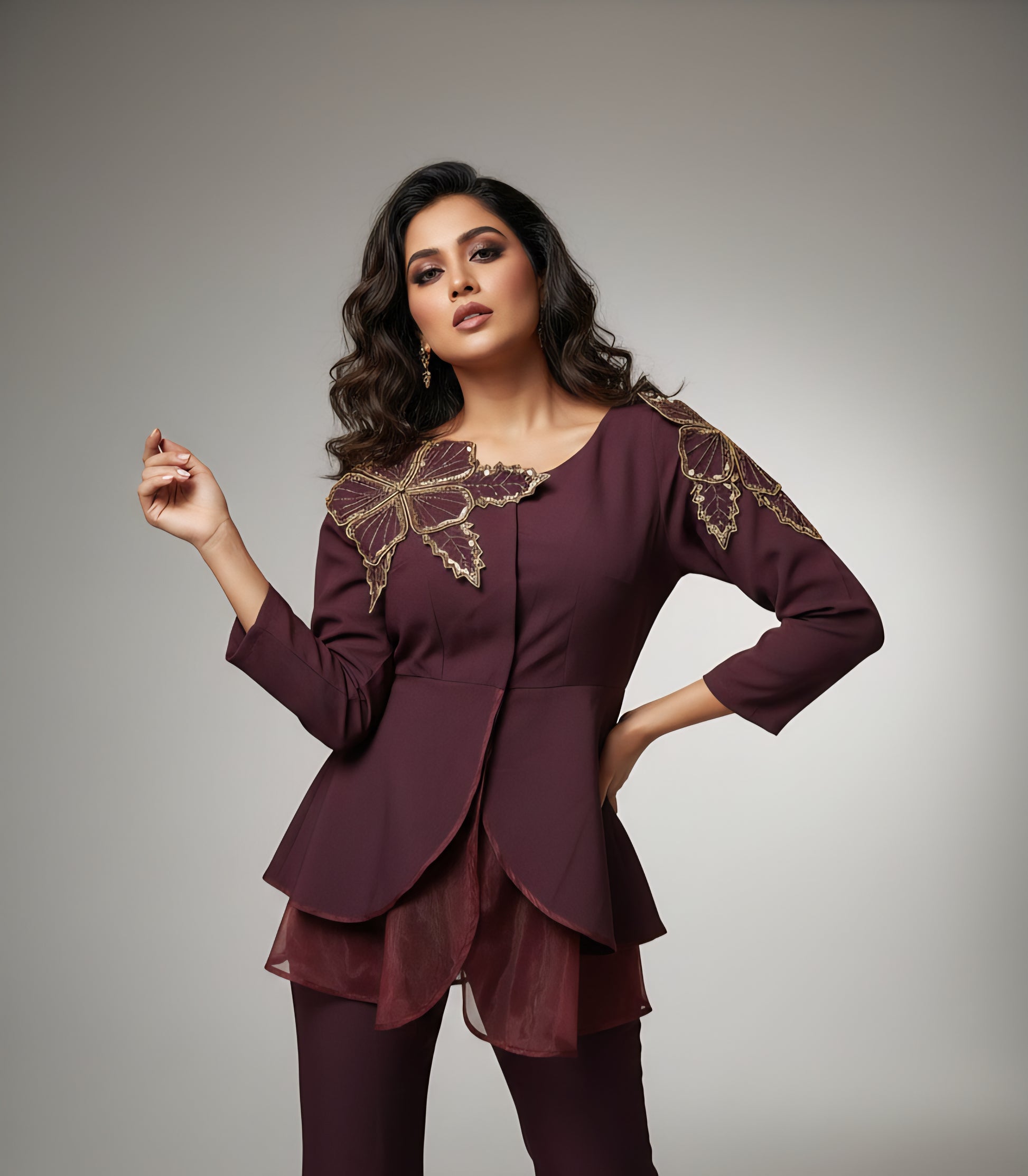 Sophisticated power dressing meets festive elegance—highlighted with statement gold leaf appliqué and a tiered organza peplum for a sharp yet feminine silhouette.