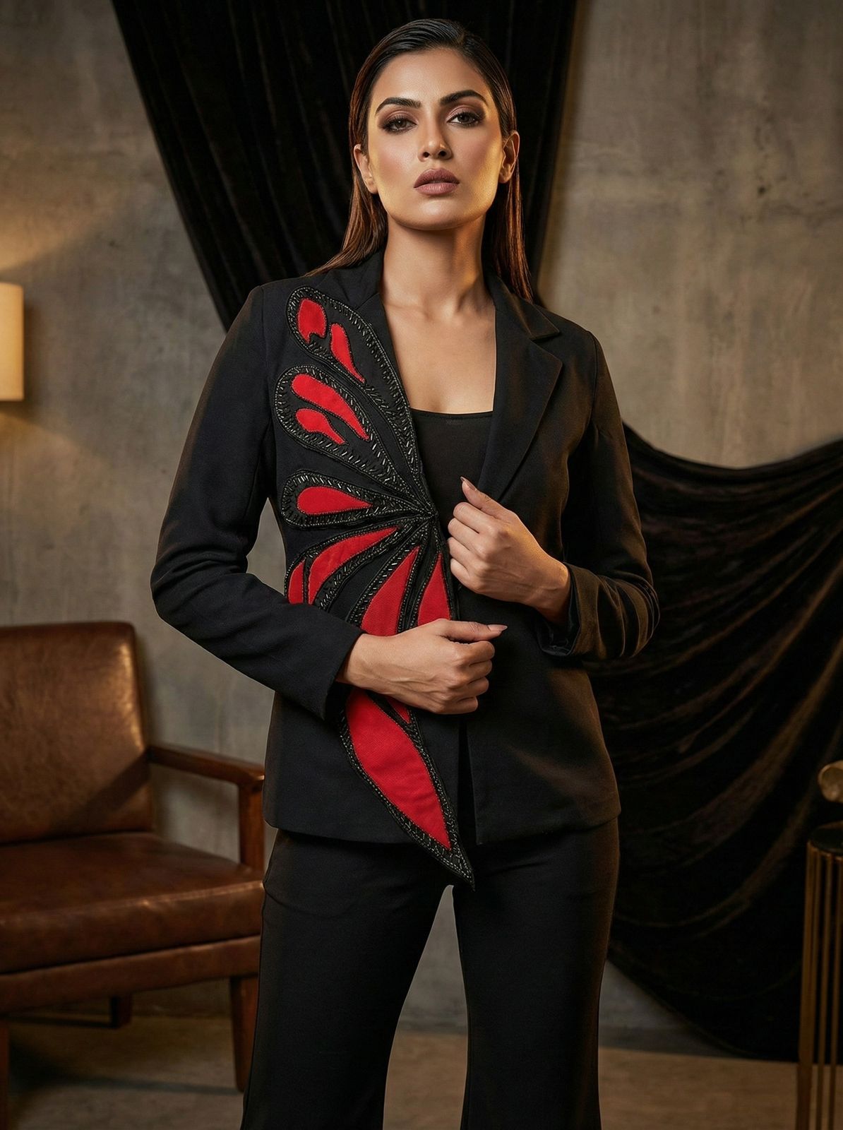 Step into effortless power with the Midnight Monarch Three-Piece Set — a statement ensemble designed for bold, modern elegance. This striking black set features a structured blazer adorned with an artistic embroidered wing motif that flows seamlessly across the front. Layered with a sleek fitted bustier and paired with tailored flared trousers, this three-piece look balances strength, sensuality, and sophistication.
