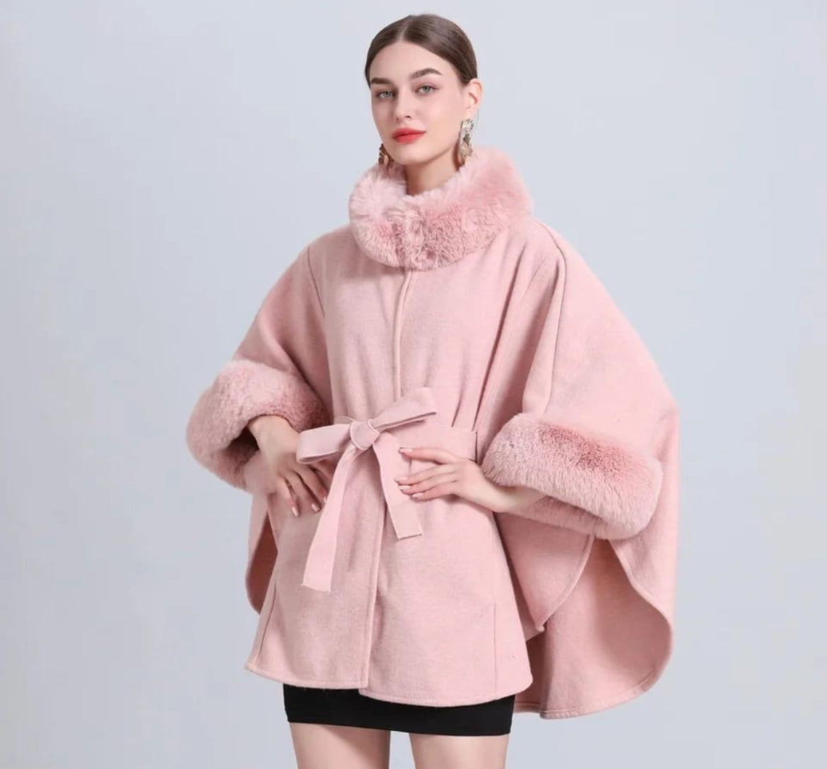 Wrap yourself in elegance with this premium fur-trim winter cape. Designed with a soft, velvety finish, oversized faux-fur collar & cuffs, and a flattering belted waist, this cape brings effortless glamour while keeping you warm.