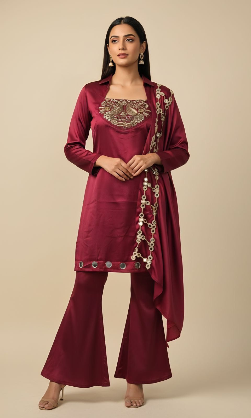 A timeless three-piece ensemble featuring a silk-finish straight kurta with a beautifully hand- embroidered yoke and mirror-work detailing on the hem. Paired with a flared sharara and a delicately embellished dupatta, this set blends traditional elegance with modern finesse.