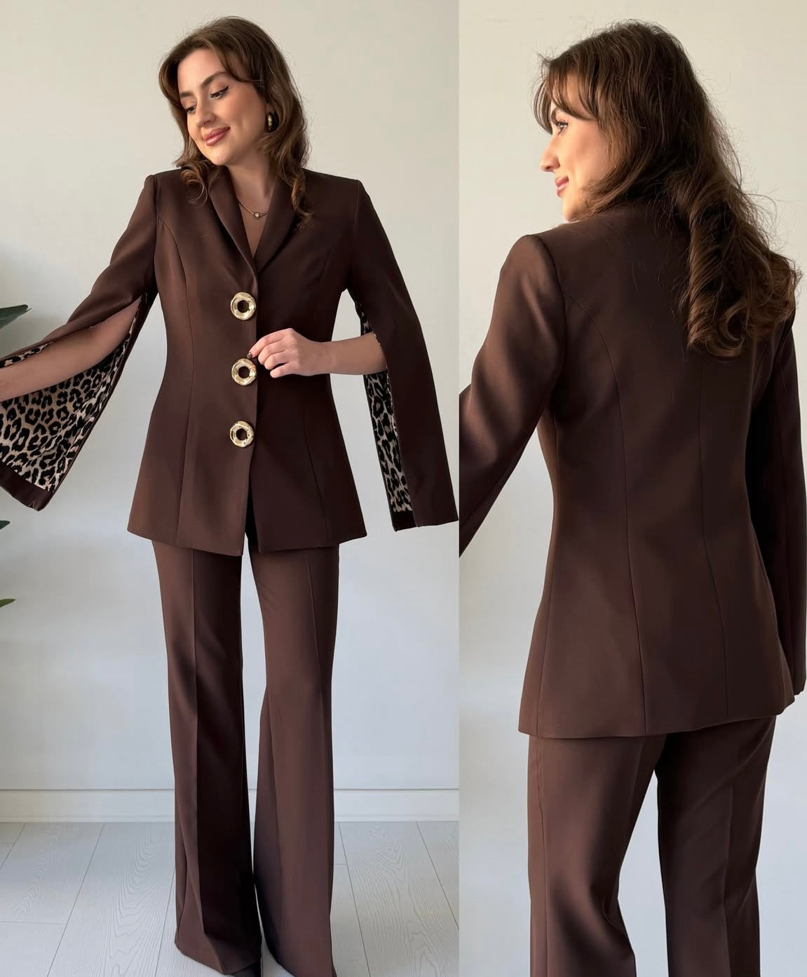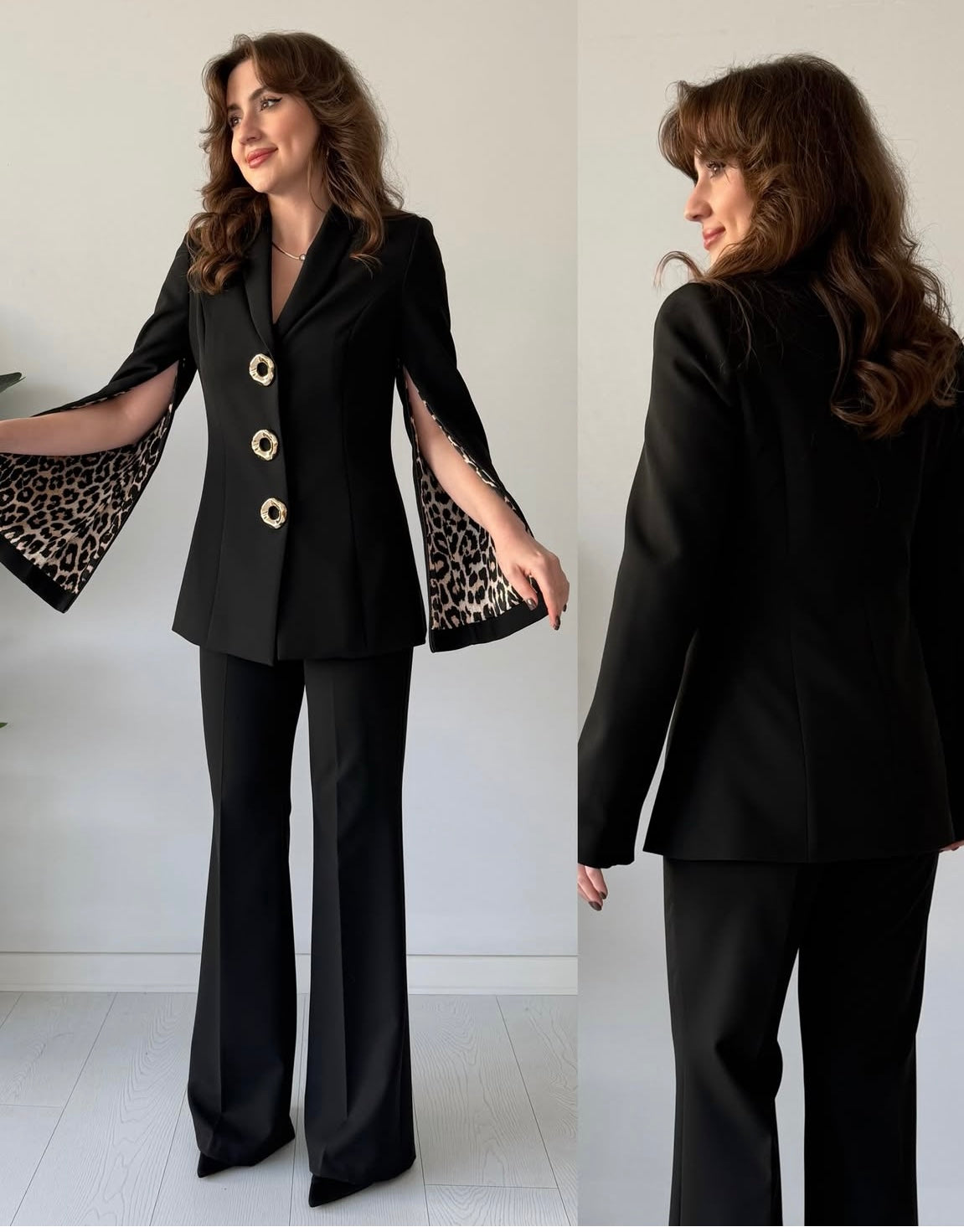 Step into effortless authority with this tailored black power suit, featuring bold gold statement buttons and dramatic slit sleeves lined with leopard print for a touch of couture edge. The structured blazer pairs with sleek straight-fit trousers, creating a silhouette that is sharp, modern, and undeniably powerful. Perfect for events, formal evenings, business settings, or high-fashion outings — a suit that speaks confidence in every step.