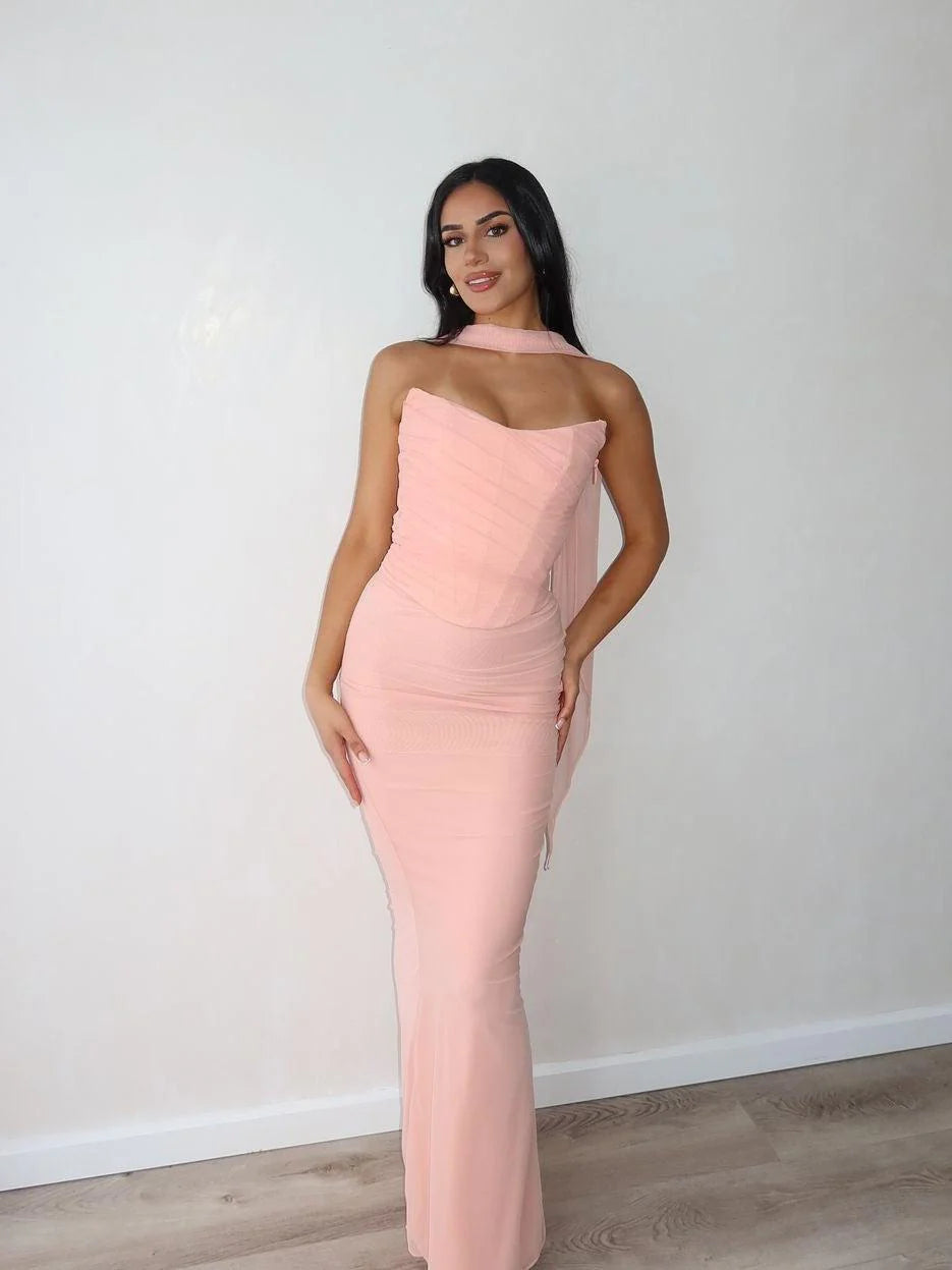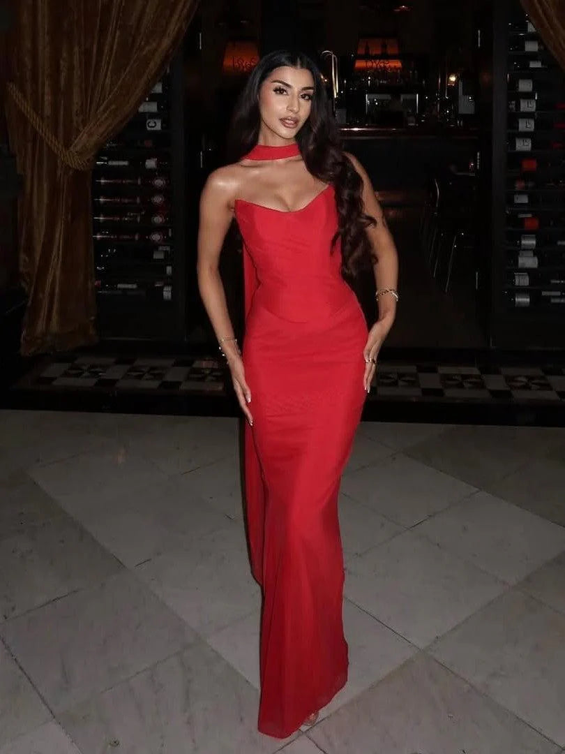 - Matching high-waist ruched maxi skirt with a body-hugging mermaid fit, designed to elongate the silhouette.