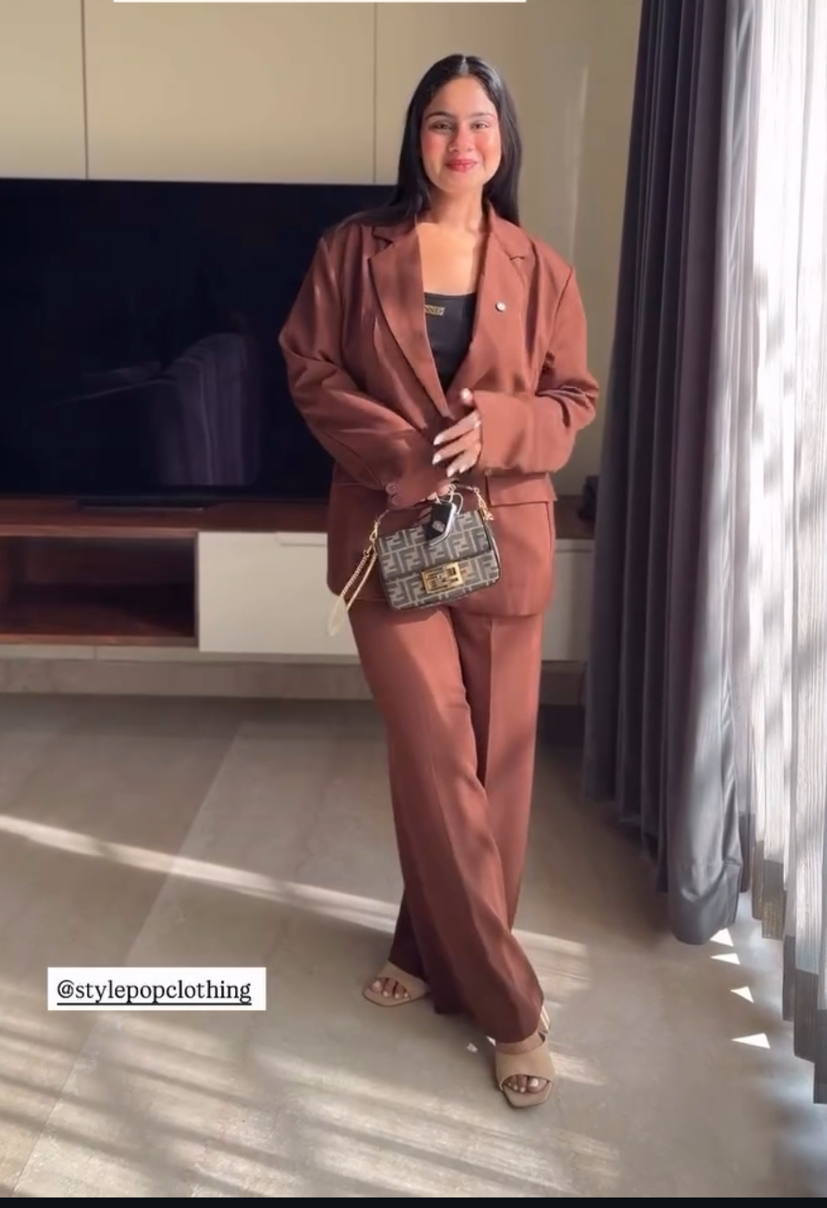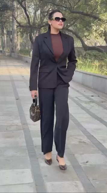 A timeless two-piece tailored power suit featuring a structured blazer and wide-leg trousers. Crafted from premium suiting fabric, this set offers a sleek, confident silhouette perfect for workwear or formal occasions. Available in espresso brown and jet black, the blazer comes with a single-button closure and flap pockets, while the high-waist pants add elegance and elongation to the look.