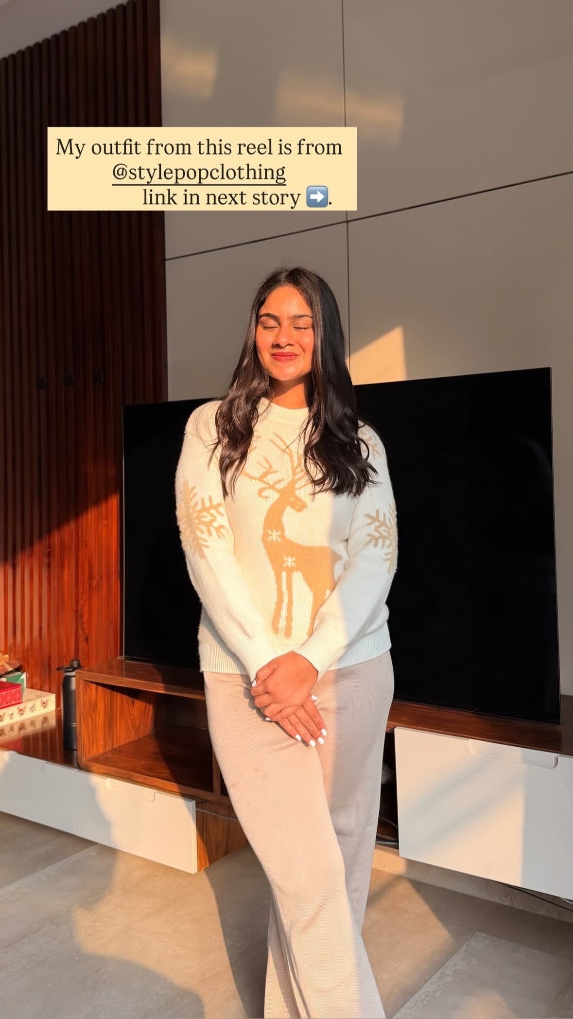 Stay cozy and chic this season with this soft beige and cream winter co-ord set. The outfit features a relaxed-fit reindeer knit sweater with snowflake detailing, paired perfectly with warm, wide-leg drawstring trousers. Ideal for casual winter outings or lounging in style, this ensemble blends comfort with festive charm.