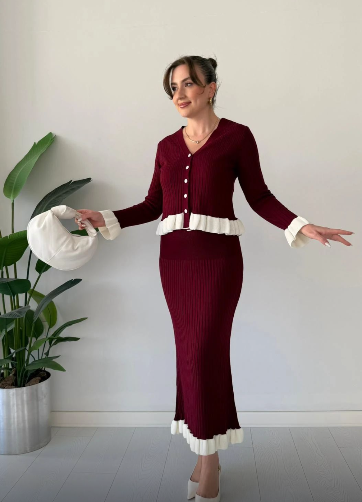 A beautifully feminine ribbed knit co-ord set featuring a fitted V-neck cardigan with pearl buttons and delicate contrast ruffle trims on the sleeves and hem. Paired with a matching long skirt accented with the same flounce detail, this set blends comfort with chic winter elegance. Soft, stretchy, and perfect for outings, brunch dates, and cozy–stylish days.